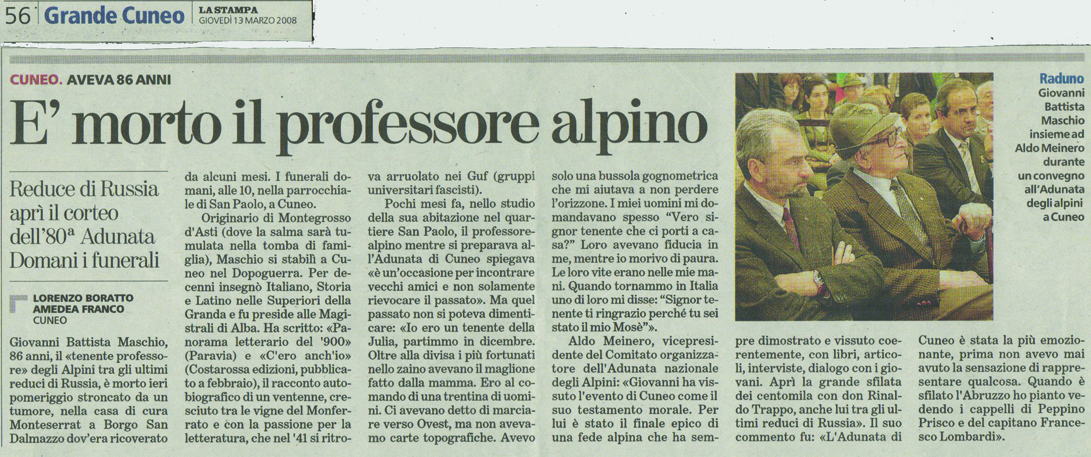 La Stampa 13 marzo 2008 Pubblicato il 10 Settembre 201713 Settembre 2017 da Memoriale Cuneense E’ morto il professore alpino Reduce di Russia aprì il corteo dell’80a Adunata